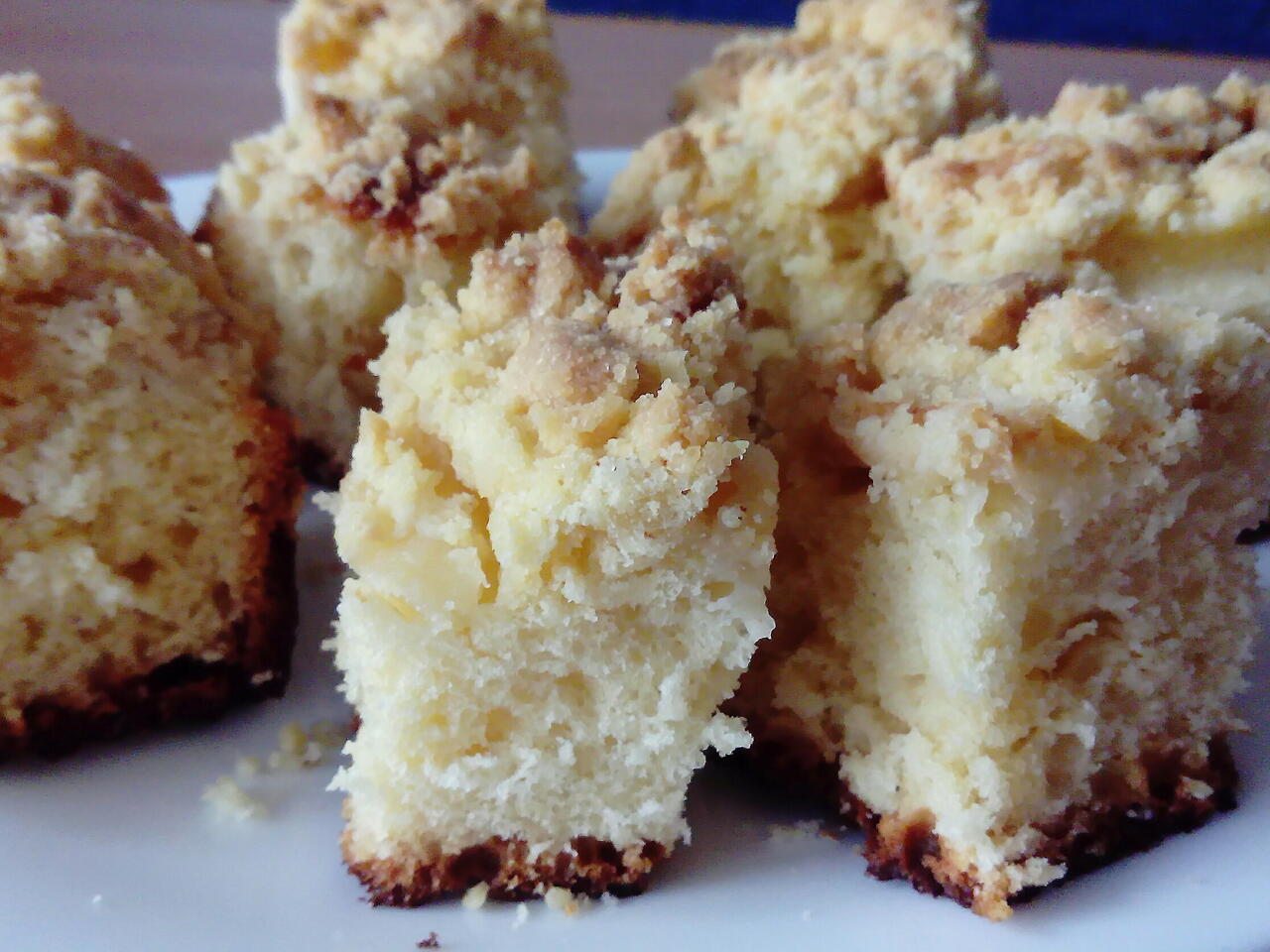 Ciasto wyłożyć na blachę, położyć owoce, na to kruszonkę.