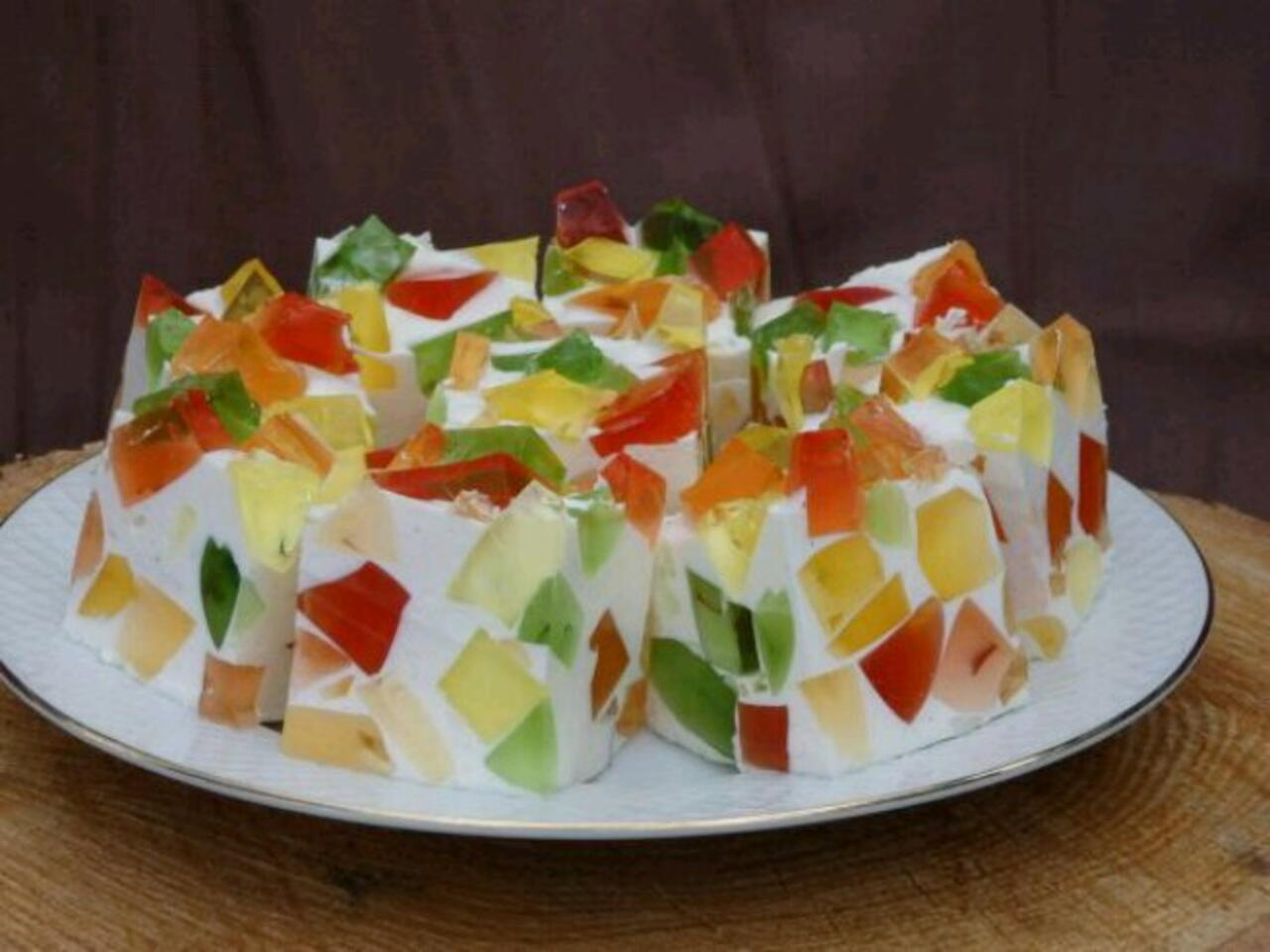 Galaretki pokroić w kostkę wszystkie kolory wymieszać razem. Odłożyć parę kostek do dekoracji