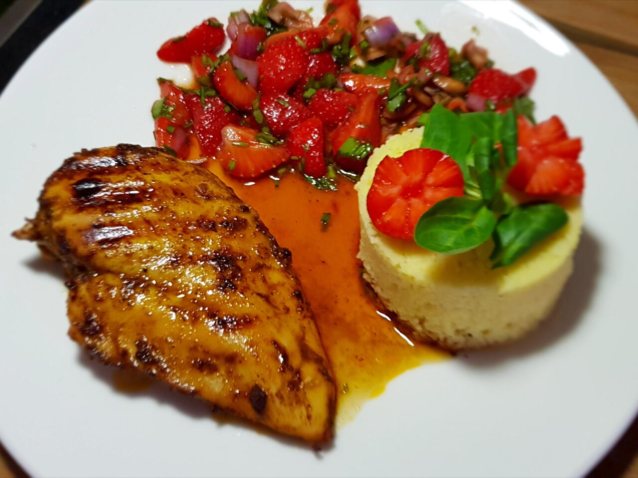 Marynaty użyłem miodowo-sojowej z papryką słodką (z chili może być lepsze) . Kurczak na grill elektryczny lub patelnie ( jeżeli nie jesteście pewnie czy kurczak się zrobił, można na chwilkę wrzucić do piekarnika bez termoobiegu )