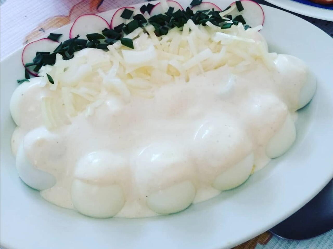 Składniki na sos mieszamy, wylewamy na pokrojone na pół jajka, i obsypujemy pokrojoną na piórka cebulą. Smacznego.