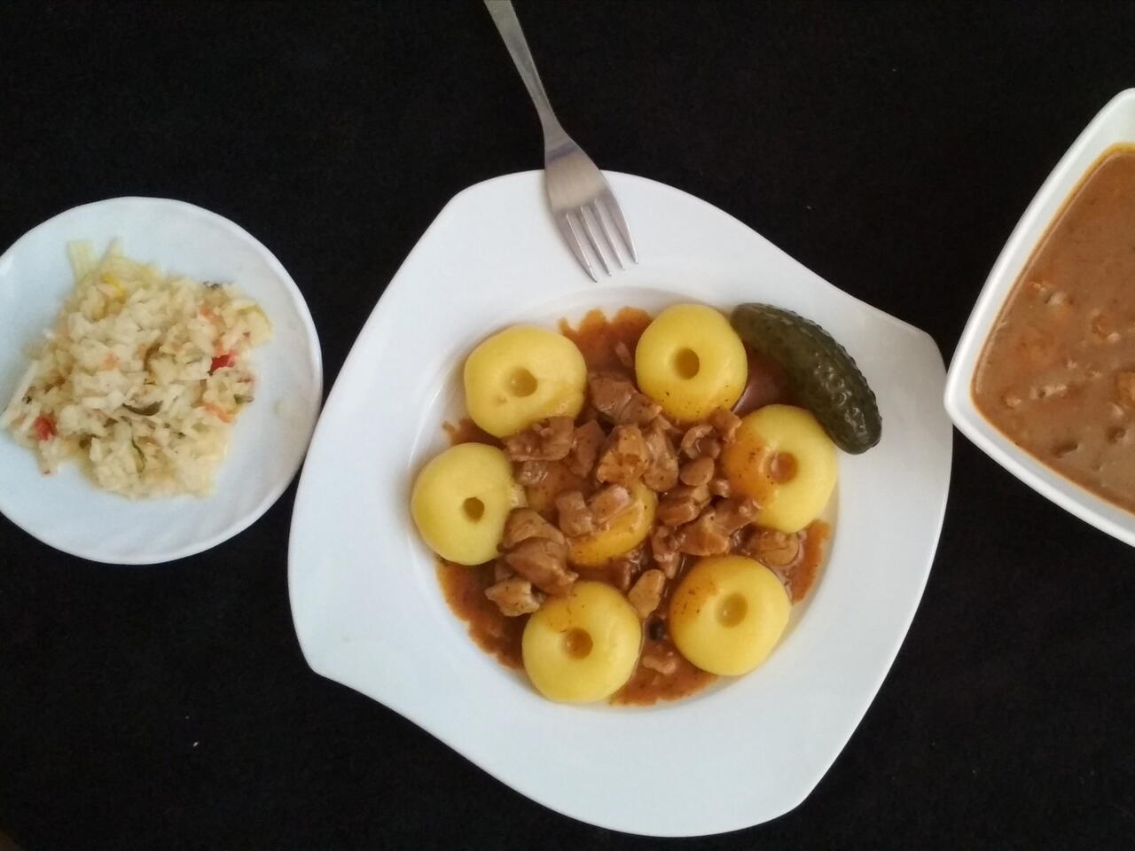 Z tej ilości ziemniaków wychodzi coś około 15szt. kluseczek. Wkładamy je wszystkie do lekko gotującej się wody, , mieszamy aby się nie przykleiły do dna garnuszka. Gdy wypłyną na powierzchnię to po około 3:30min. wyciągamy je (jest i drugi sposób, mierzymy czas od samego początku, znaczy od razu po wrzuceniu klusek do gotującej się wody i wyciągamy po 7 minutach). Ja to robię pojedyńczo bezpośrednio na talerzyk. Zalewam je gulaszem i podaję z jakąś suróweczką lub korniszonkiem 😉
