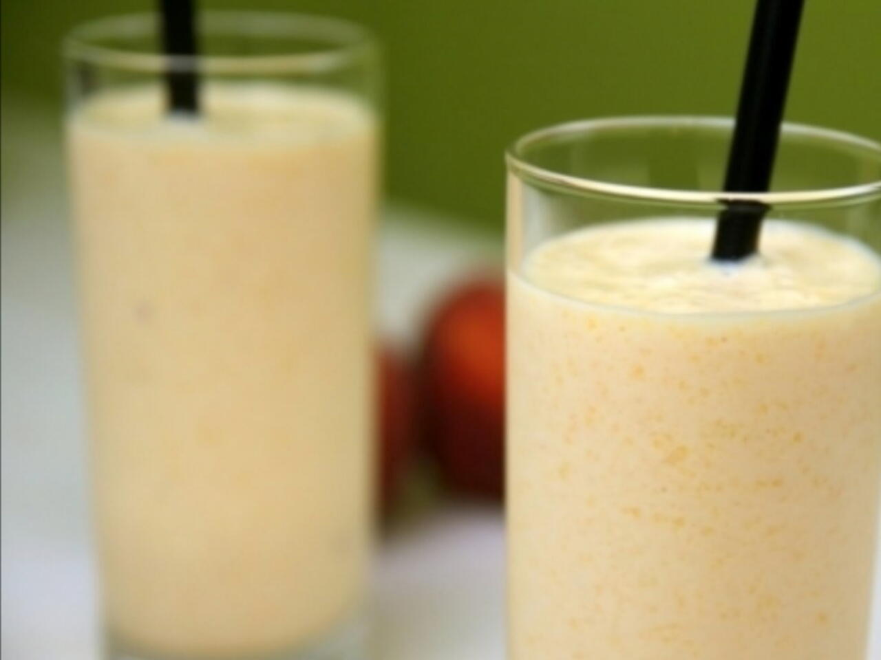 Namoczone płatki zmiksować z brzoskwinią, obranym bananem, sokiem i jogurtem.