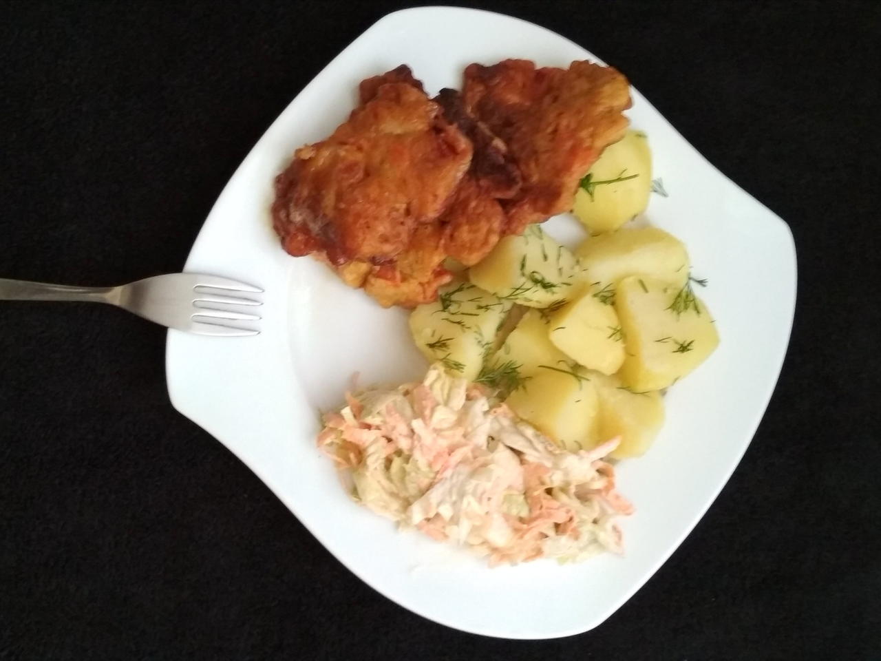 Smażymy jedną stronę kilka minut, tak do uzyskania złotego kolorku i postępujemy tak z drugą stroną kotlecika. No i tutaj już tak na prawdę mamy po całym kucharzeniu 😉. Nakładamy nasze kotleciki na talerzyki razem z ziemniaczkami oraz jakąś naszą ulubioną suróweczką.