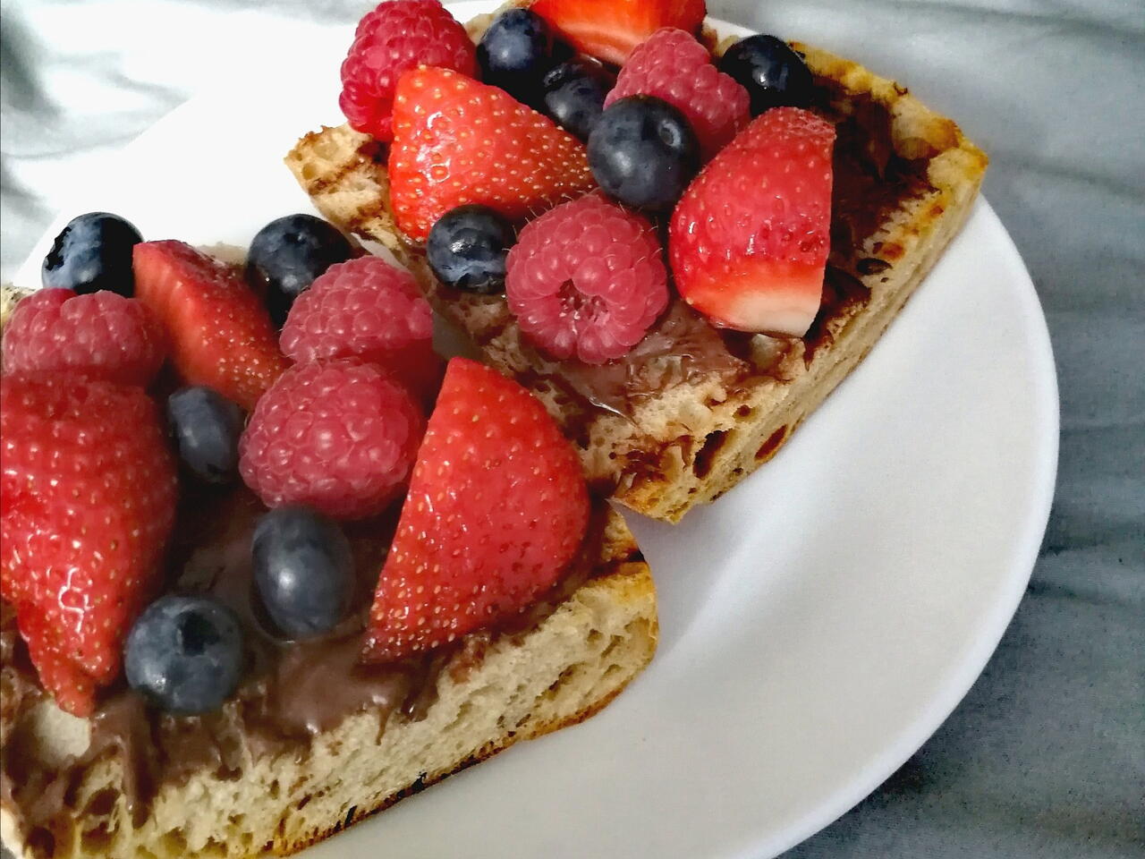 Po wyciągnięciu smarujemy nutellą i dekorujemy dużą ilością owoców sezonowych.