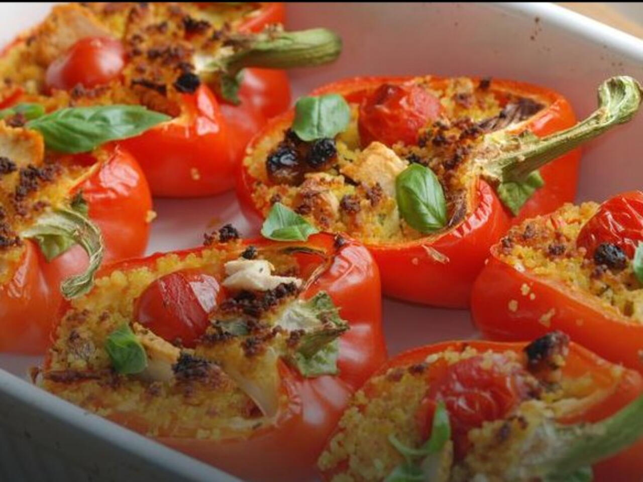 Piekarnik nagrzać do 200°C. Papryki przekroić na połówki (postawić pionowo na desce i przekroić pionowo). Usunąć nasiona, a wnętrze doprawić solą i pieprzem, skropić oliwą i ułożyć w naczyniu żaroodpornym.