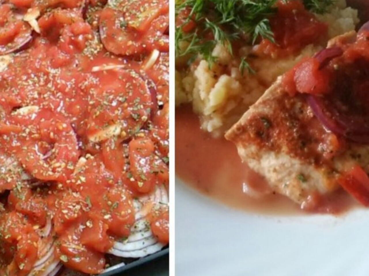 Do żarnoodpornego naczynia wrzucamy pomidory z puszki, na to paprykę. Przyprawiamy solą, pieprzem i lubczykiem. Na taki spód kładziemy przyprawione piersi z kurczaka przekrojone na pół. Na to kładziemy pokrojony czosnek i cebulę, przyprawić. Dodać na górę puszkę pomidorów, przyprawiamy solą, pieprzem, lubczykiem i oregano. Pięć w 180 stopniach.
