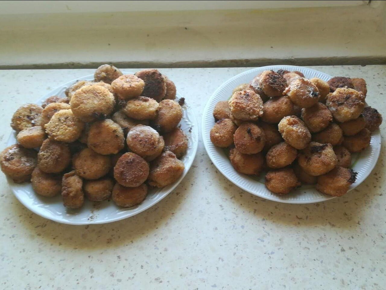 Każdy kotlecik maczamy w rozbełtanym jajku i bułce tartej. Smażymy na średnim ogniu na złoto-brązowy kolor.