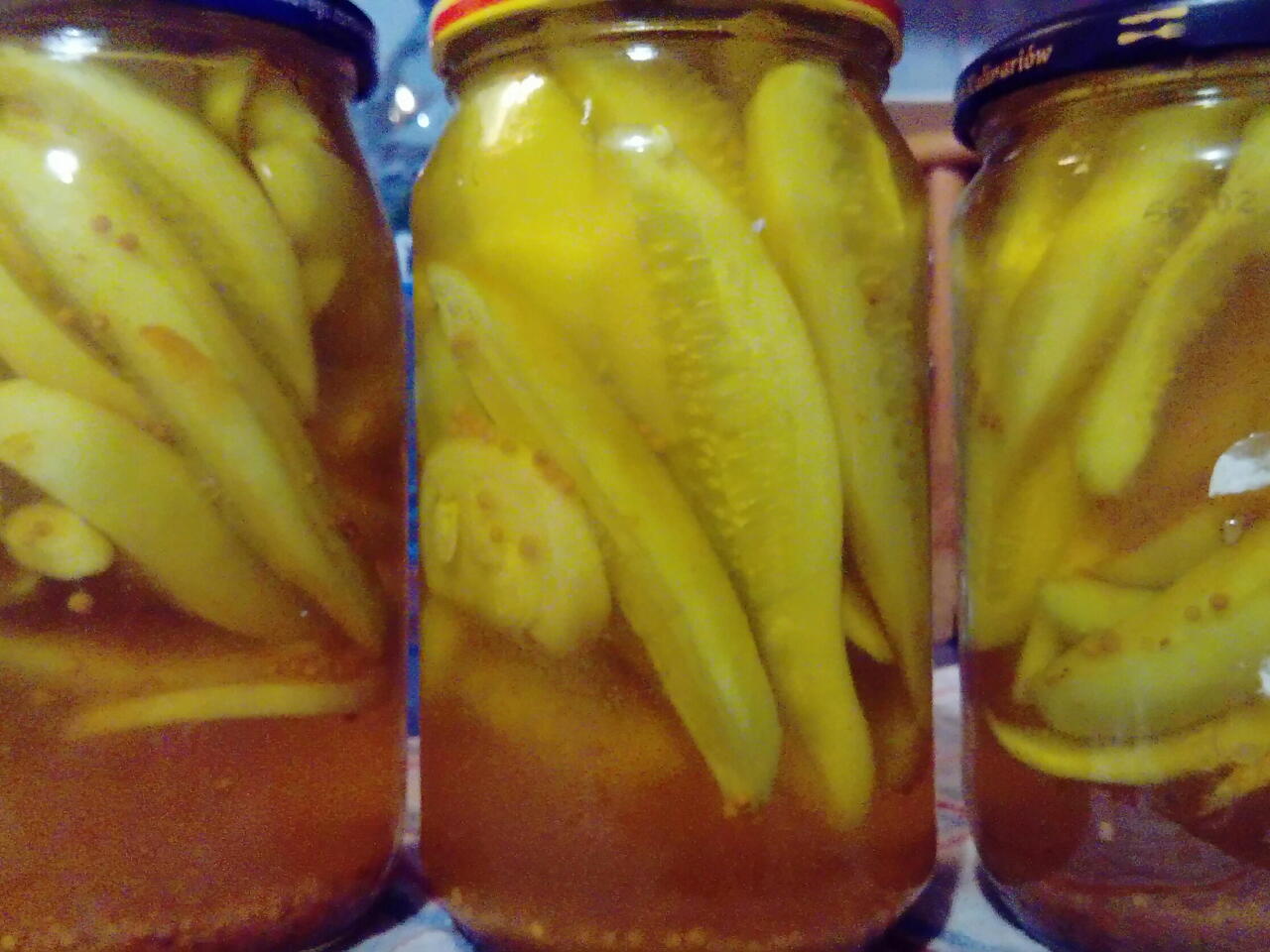 Zalać pikle gorącą zalewą. Pasteryzować przez 5 minut od zagotowania. Z przepisu wychodzi 5 słoików ogórków 0.9 l. Zalewy z przepisu wystarczy na 4 słoiki 0.9 l.