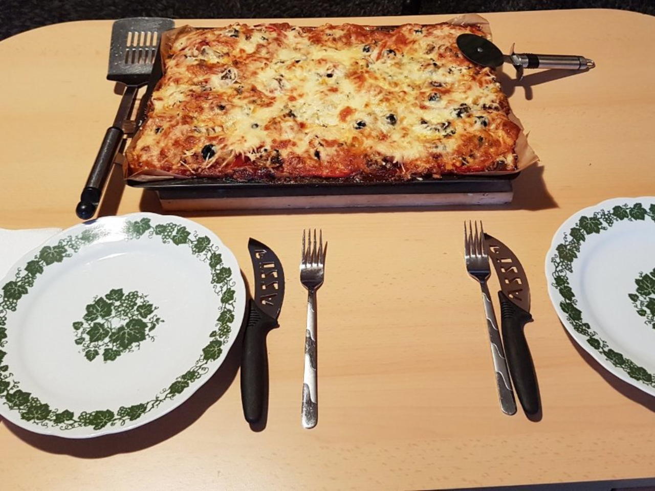 Ciasto rozwałkować i położyć na oliwionej przed formie. Rozprowadzić sos. Całość udekorować na własny sposób.