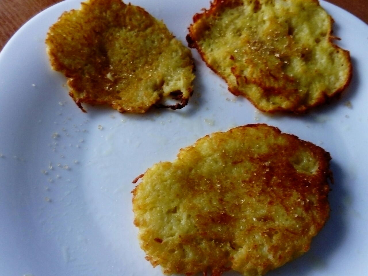 Ziemniaki zetrzeć na tarce, zetrzeć cebulę. Dodać jajko, mąkę i sól. Wymieszać. Rozgrzać olej. Smażyć na złoty kolor z obu stron. Posypać cukrem. Smacznego.