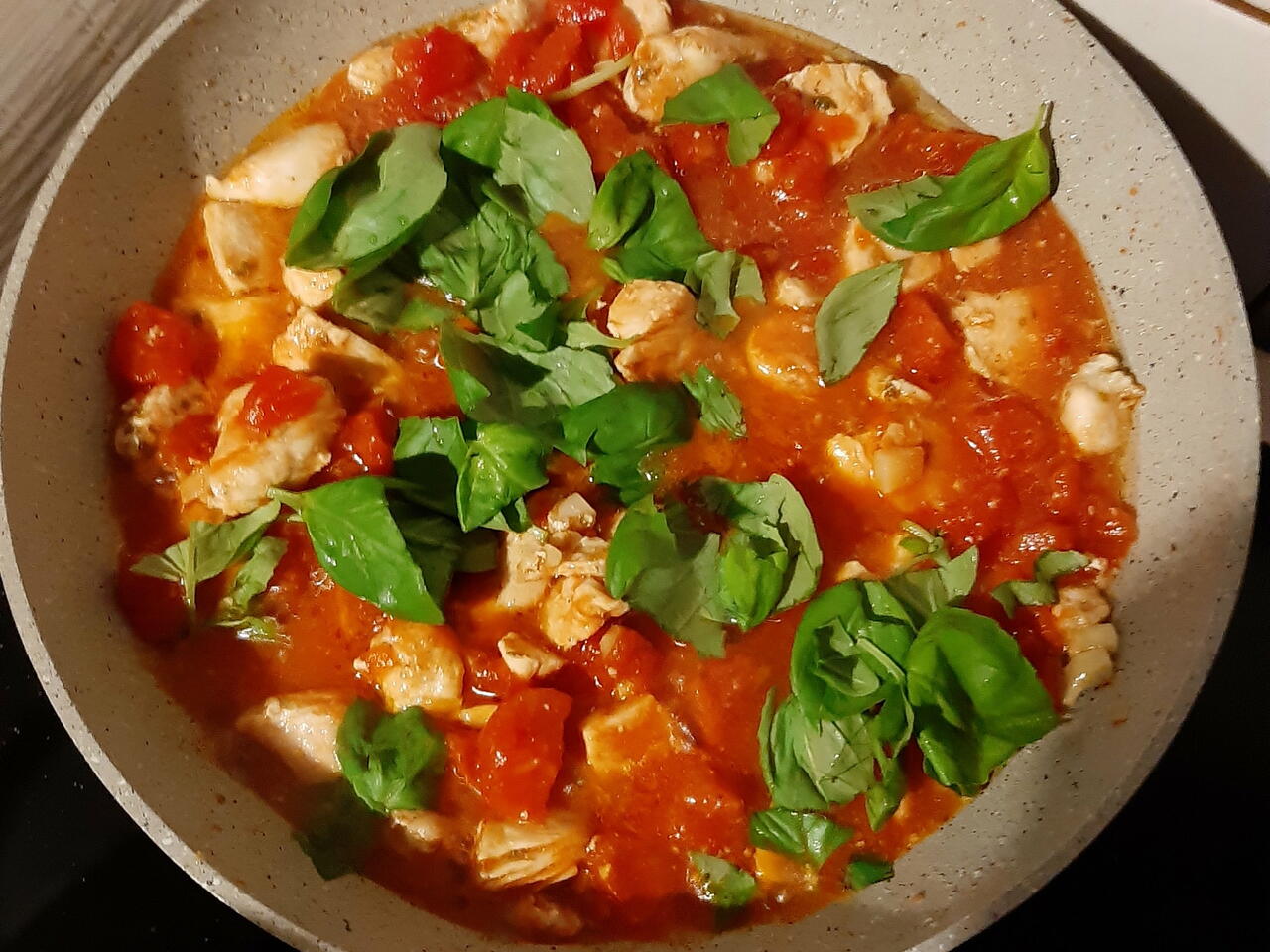 Pierś z kurczaka w pomidorach i świeżą bazylią.
