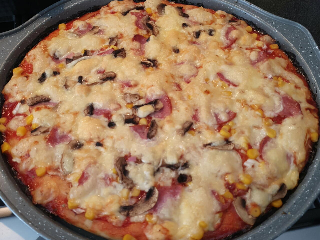 Pizze pieczemy krótko, około ~10min, w wysokiej temperaturze. W naszym piekarniku sprawdza się 220°C z grzaniem dolnym, blacha na środku piekarnika.