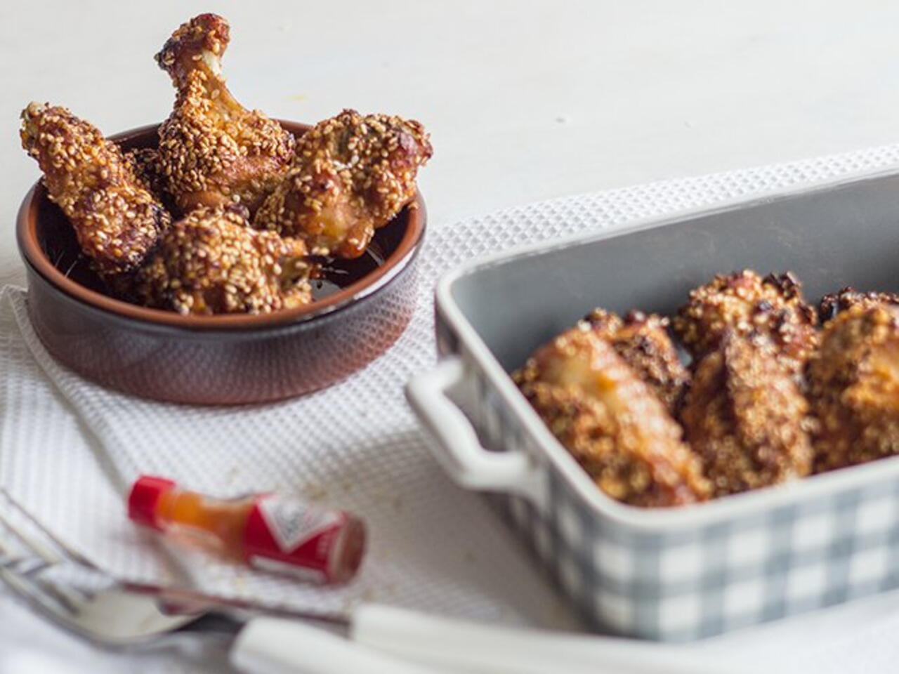 Skrzydełka wyjąć z patelni i posypać sezamem