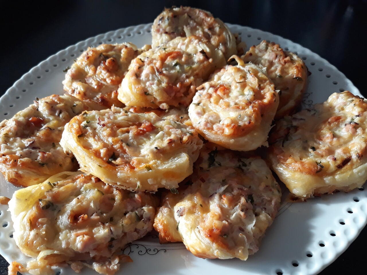 Rozłóż ciasto francuskie. Przygotowany farsz rozsmaruj na ciasto (pozostaw brzegi do sklejenia) i zwiń jak strudel.