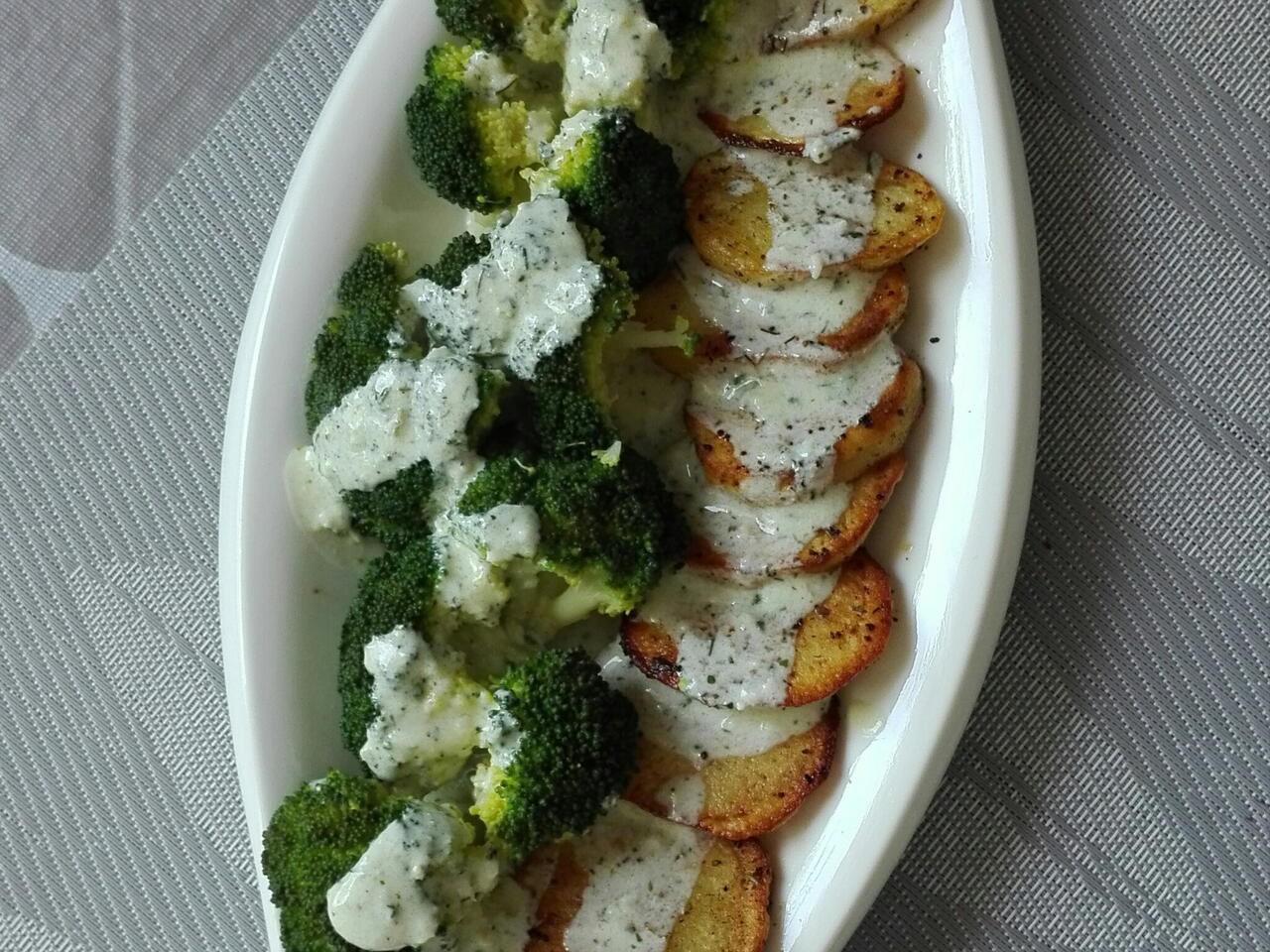 Smażone Ziemniaki i Ugotowane Brokuły Z Sosem Czosnkowym