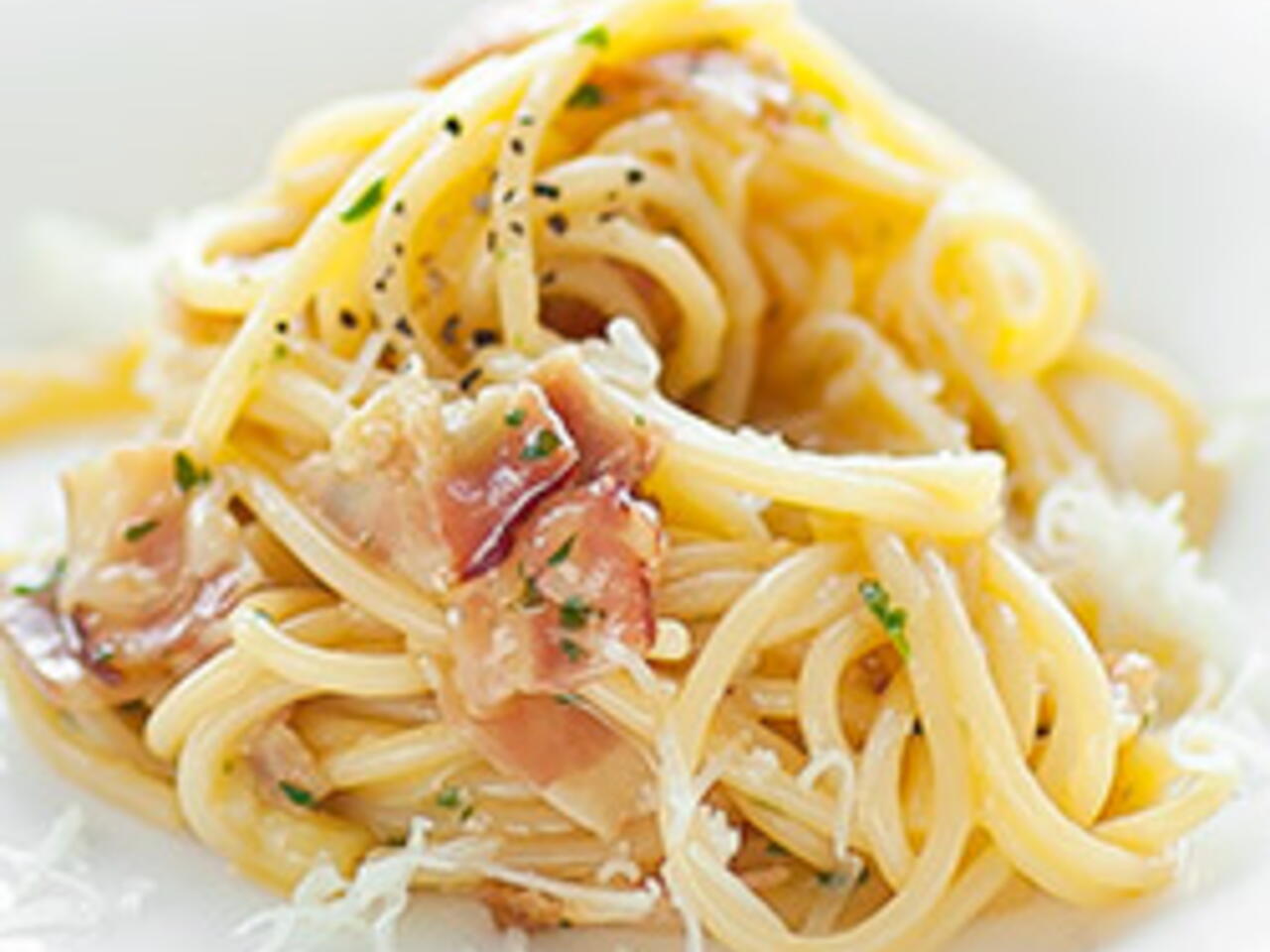 Nasze spaghetti carbonara rozkładamy na talerze, posypujemy resztą sera oraz doprawiamy szczyptą czarnego pieprzu. Smacznego!