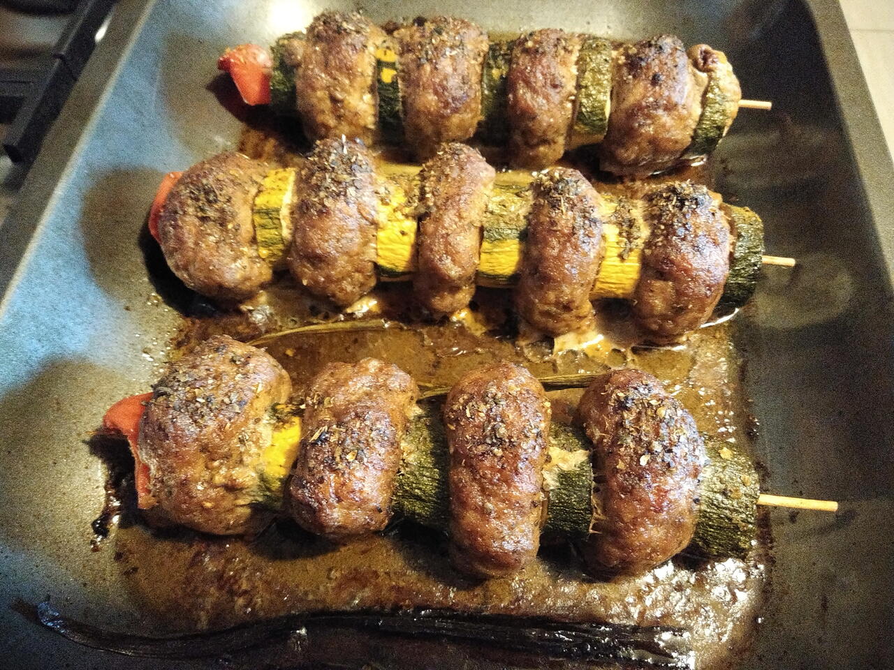 Połączyć składniki, uformować kulki, nadziewać na patyczki do szaszłyków na przemian z cukinią pokrojoną w centymetrowe krążki. Posmarować olejem. Piec w piekarniku z funkcją grill.
