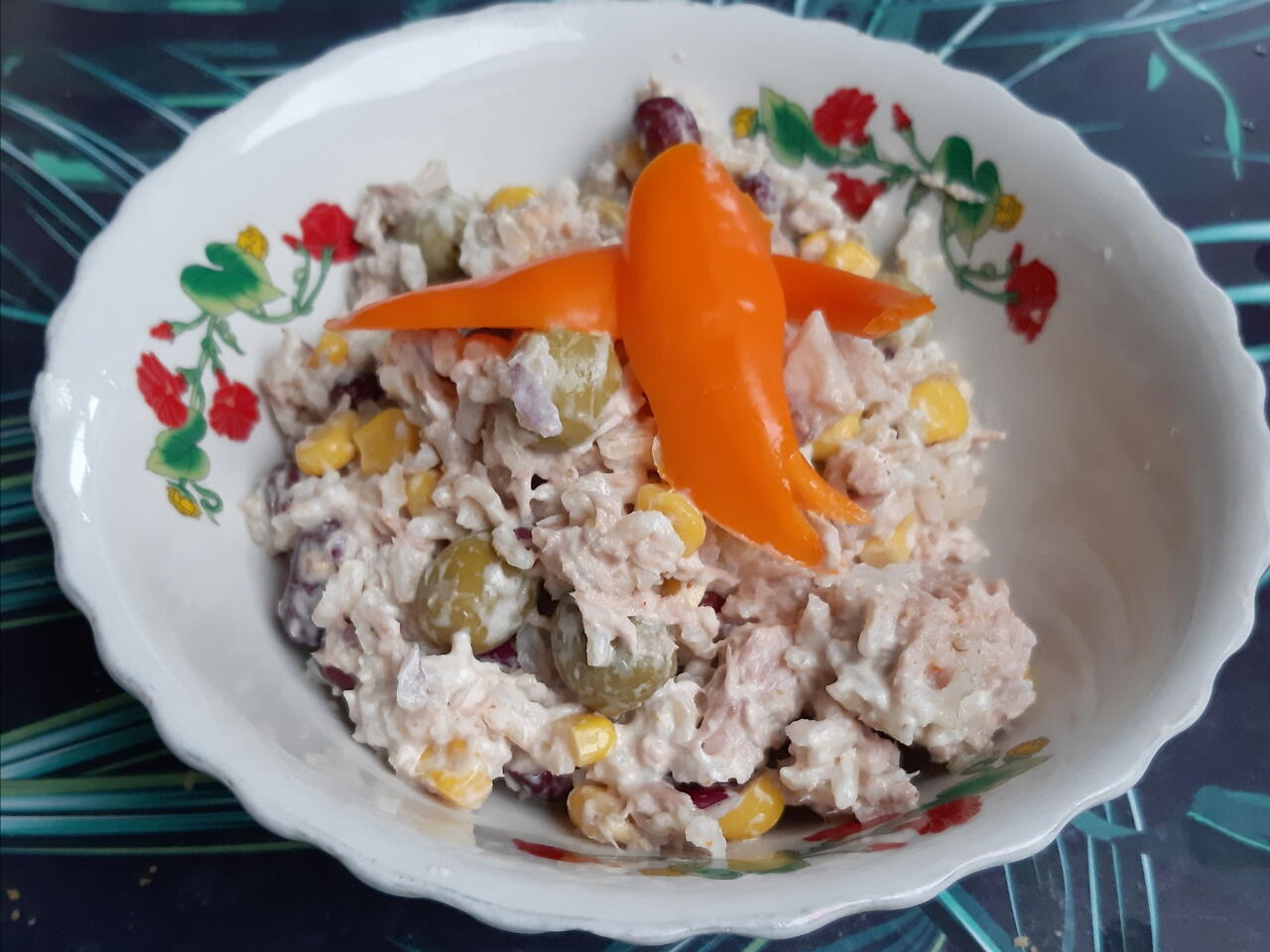 Do miski wsypujemy kolejno składniki, tuńczyk, kukurydzę, fasolę i oliwki oczywiście odlewamy wcześniej zalewy z puszek i słoika.