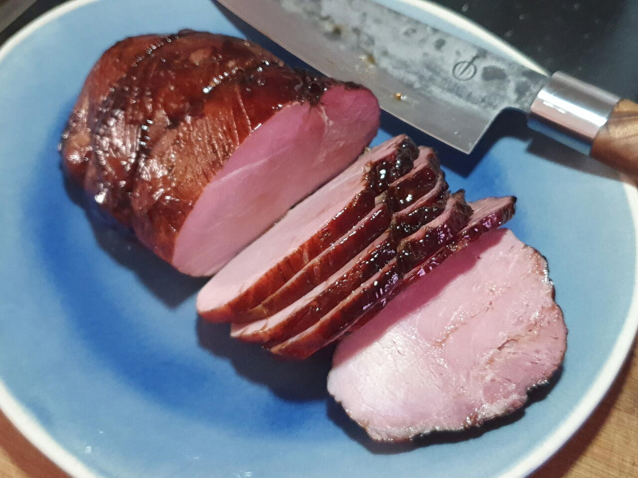 Szynka jest trochę klejąca do palców podczas krojenia ale to dzięki glazurze, bardziej zapieczona była by chrupiąca. Można trzymać kilka dni.