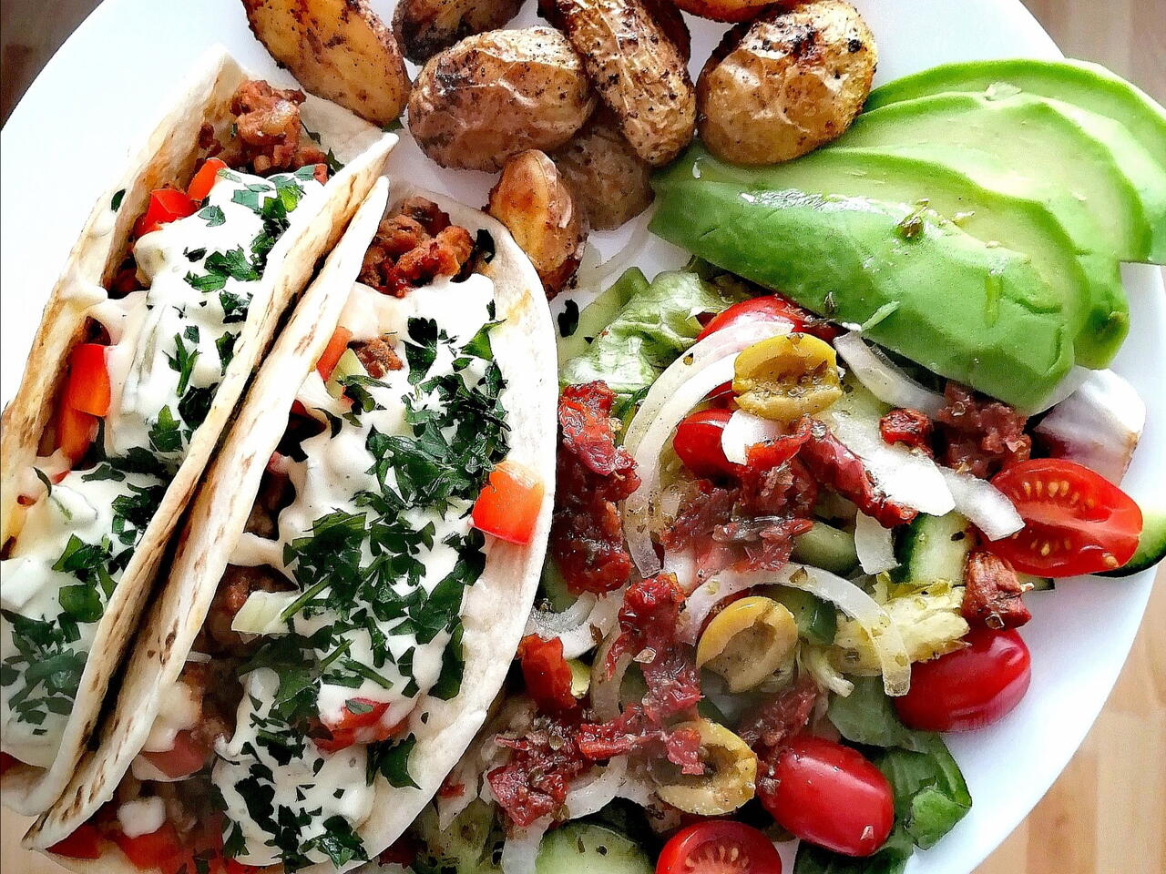 W tym czasie przygotuj Sos mieszając Jogurt, natkę, i sok z cytryny. Doprawić solą, pieprzem i odrobiną cukru. Tacos najczęściej podaje z ziemniakami z piekarnika i lekka sałatką.