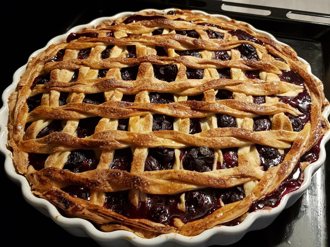 Na natłuszczonej formie rozprowadzamy 3/4 ciasta, pamiętając o naciągnieciu go na boki formy. Nakłuwamy ciasto. Następnie rozprowadzamy nasze wiśniowe nadzienie, pomijając sok z dna miski. Pozostałą 1/4 ciasta wałkujemy na podsypanej mąką desce i wycinamy równe paseczki. Następnie układamy je w kratkę na nadzieniu.