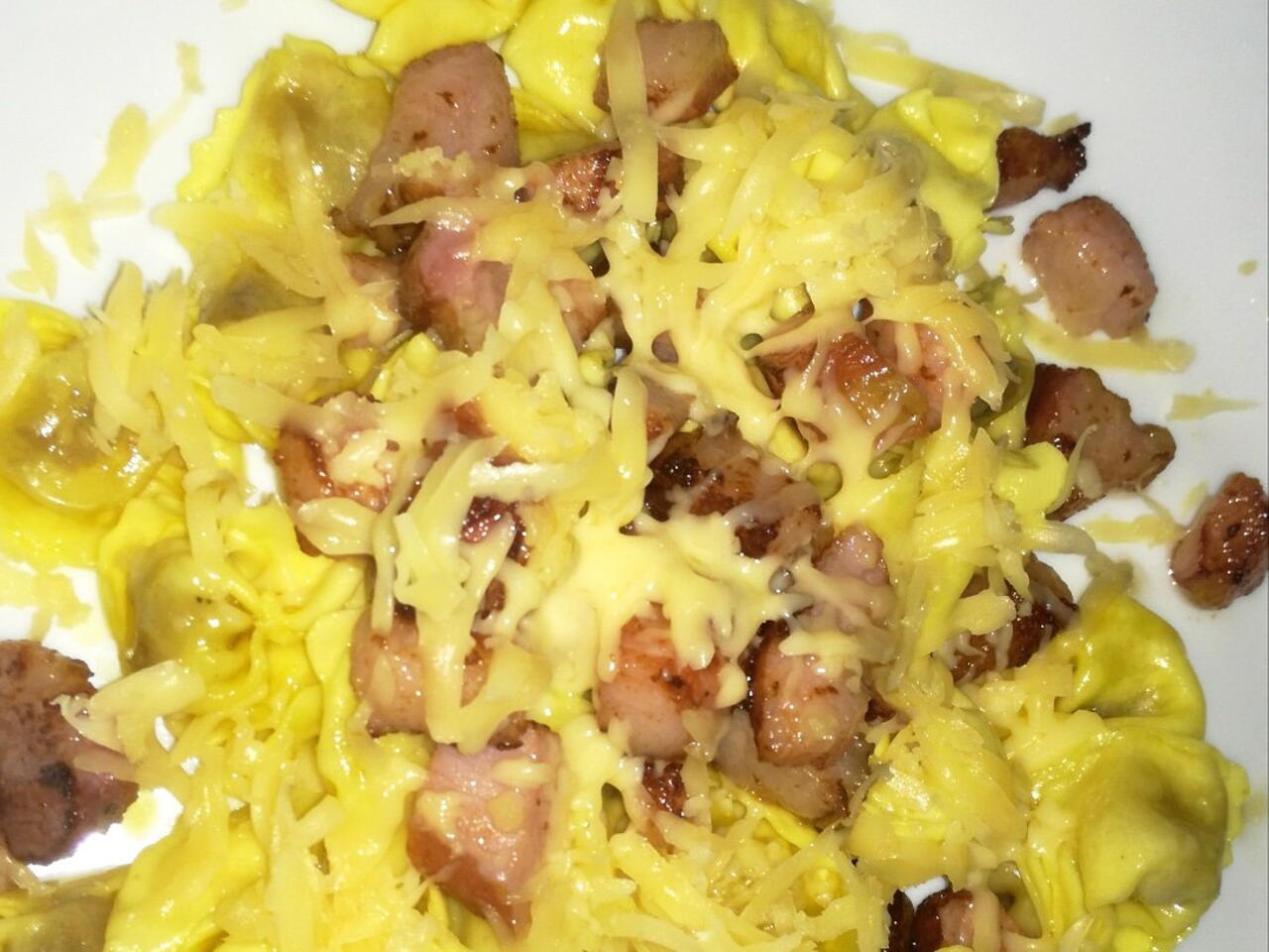 Kiedy boczek zrumieni sie na patelni to do przełożonych pierożkow dodaje odrobinę masła,mieszam.Jak masło się rozpuści, dodaje boczek a na sam koniec posypuje wszystko startym serem.