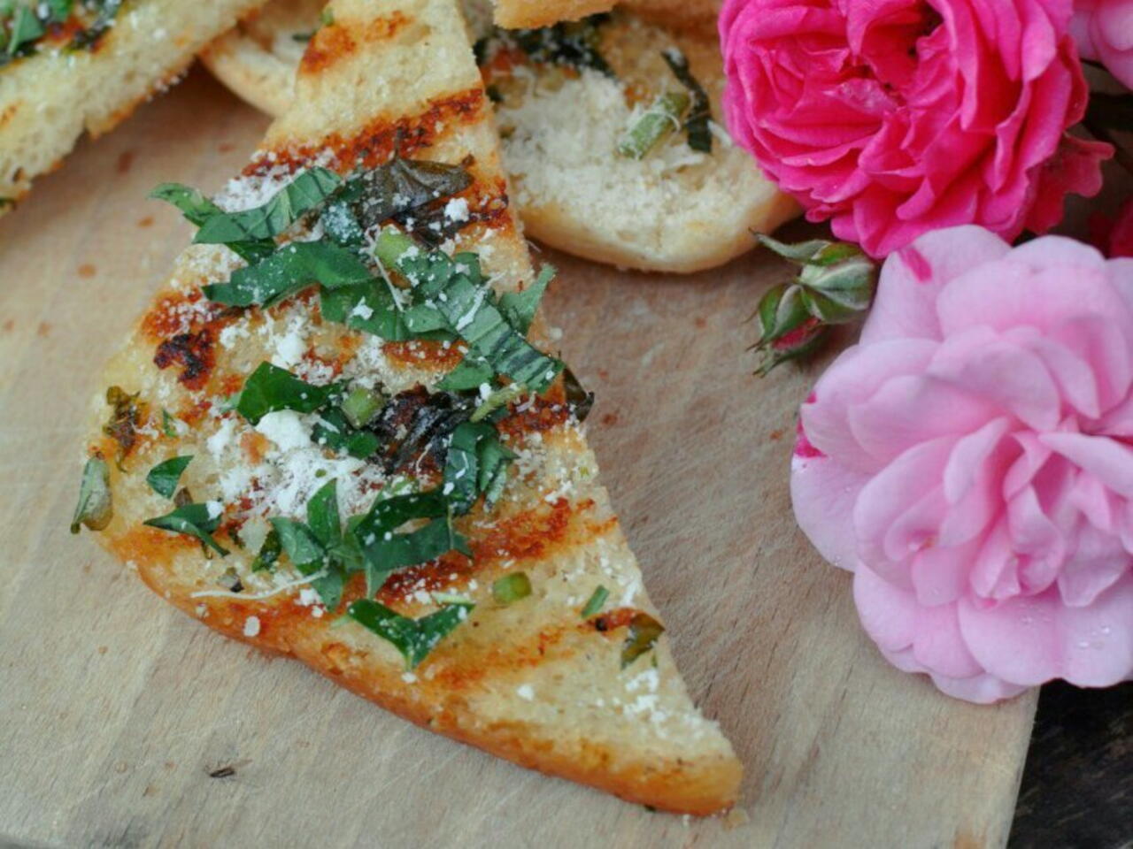 Gotowe tosty podajemy z tartym parmezanem, obsypane świeżymi ziołami.