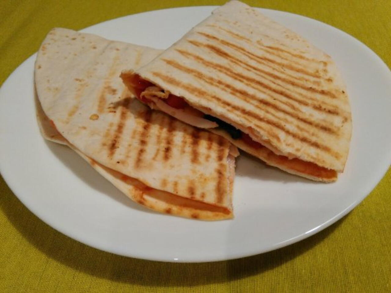 Na połowę tortilii nałóż utartych ser, szynkę. Paprykę i Oliwki pokrój w kostkę, wszystko nałożone złóż.Włóż na rozgrzaną patelnię, ja użyłam patelnię-gril.