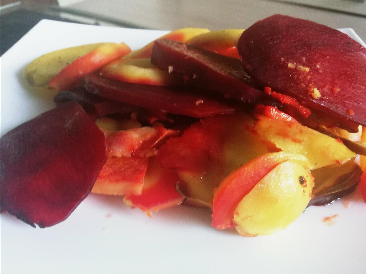 W naczyniu żaroodpornym układamy warstwami boczek, buraki, ziemniaki. Każdą warstwę ziemniaków obruszamy solą i pieprzem