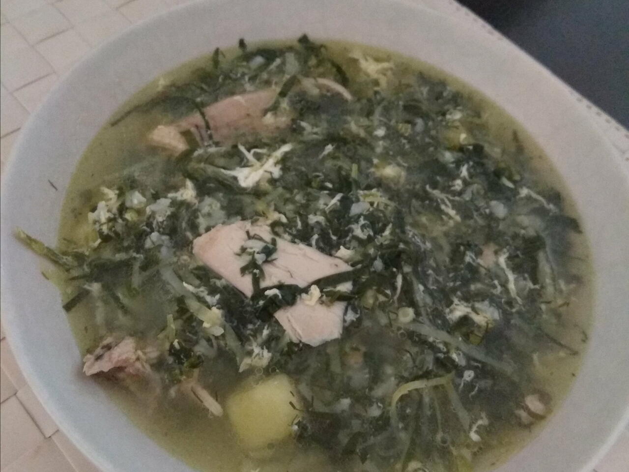 Z rosołu usuwamy korzenie i kurczaka. Do wrzącego rosołu najpierw wykładamy ziemniaki. Przez 3-5 min wykładamy wszystkie zielone z miski i gotujemy do miękkości ziemniaków (około 10 min)