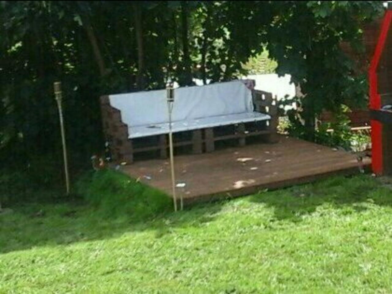 Należy dopasować jak na zdjęciu 7 sztuk palet. Pomalować impregnatem, przybić folie wodoszczelna na siedzisko. czas wykonania 120min.