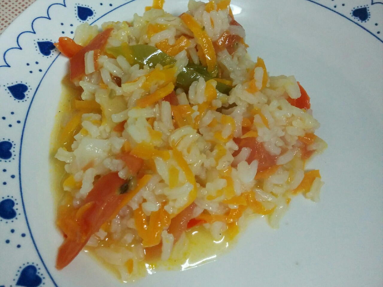 De seguida coloquei o tomate cortado aos pedaços e deixei estufar um pouco, mexendo sempre. Coloquei então a cenoura ralada e deixei estufar mais um pouco. 3 a 4 minutos depois coloquei o arroz a estufar mexendo sempre e envolvendo bem.