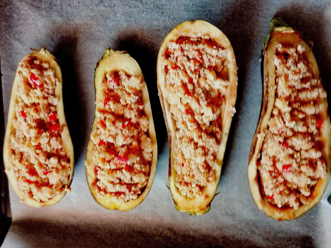 Rechear as beringelas com o preparado e polvilhar com queijo mozzarella ralado