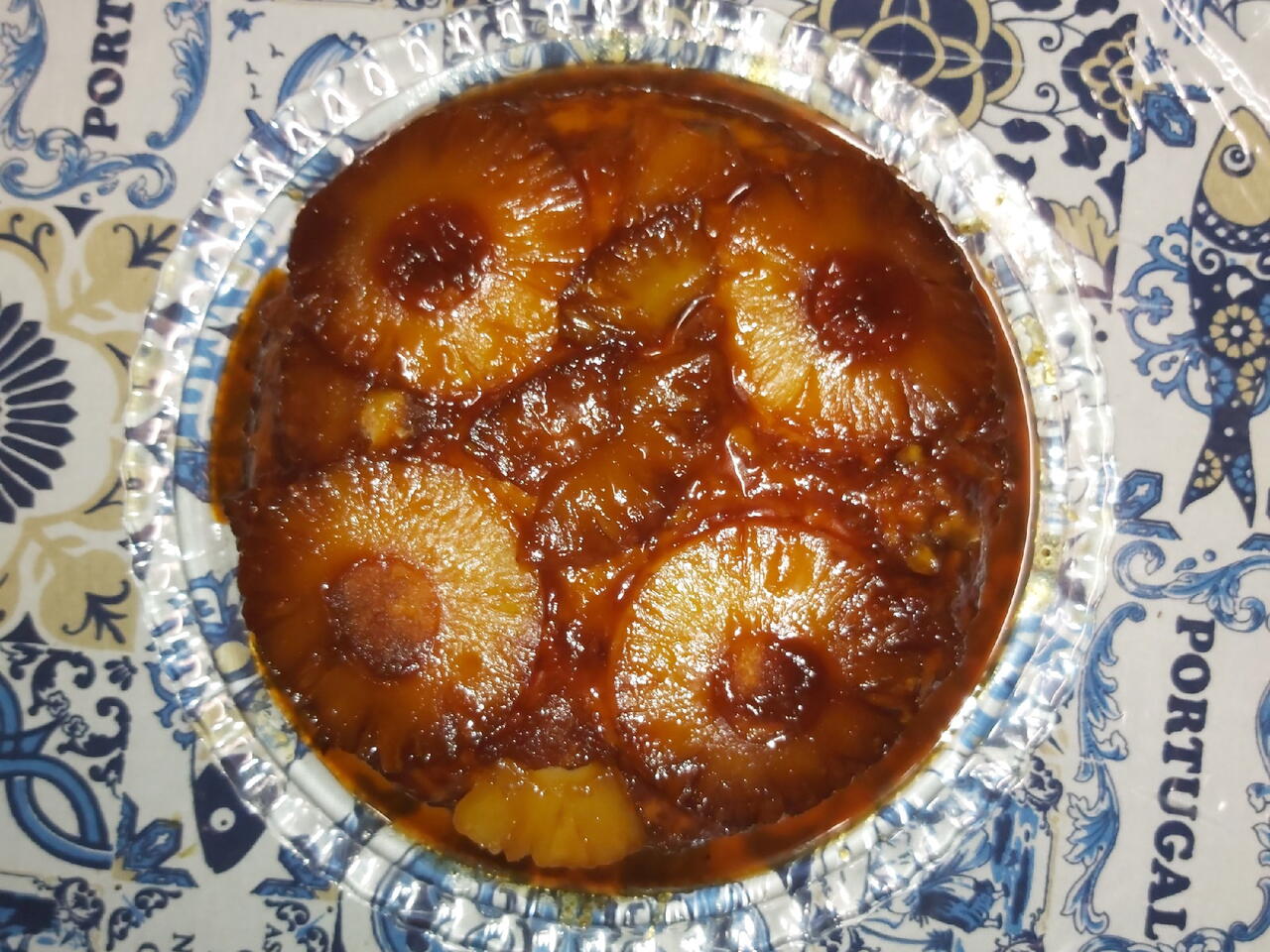 Para a calda: Levar ao lume o açúcar com a água. Deixar até ficar em calda. Entretanto unta uma forma redonda com margarina e polvilha com farinha. Depois da calda estar no ponto, verter na forma espalhando por toda a área interior. Depois cobrir o fundo da forma com rodelas de ananás ao gosto. Reservar.