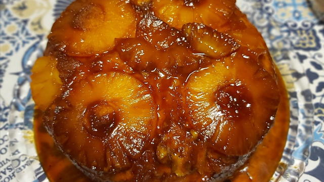 Para o bolo: Na batedeira deitar os ovos e o açúcar e bater até ficar cremoso. Depois acrescentar o óleo, o leite, e duas rodelas de ananás aos bocadinhos com alguma calda ao gosto. Continuar sempre batendo, depois deitar a farinha e o fermento. Deitar na forma e levar ao forno por cerca de 50min a 180°.