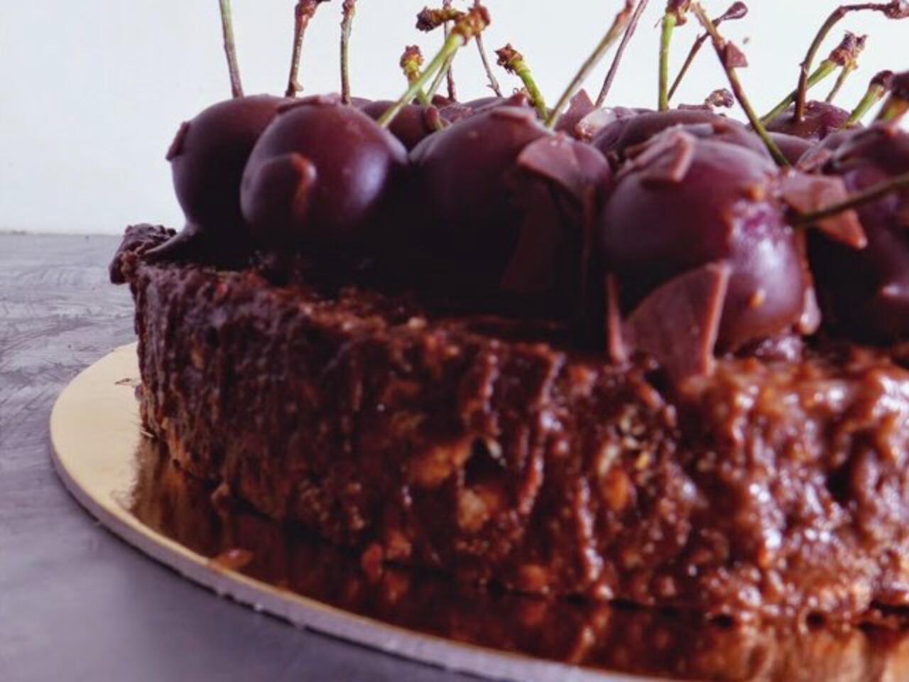 Misturar a bolacha maria triturada com o chocolate. Colocar a massa numa forma de forno amovível. Decorar o topo com as cerejas e levar ao frigorífico por 4 horas.