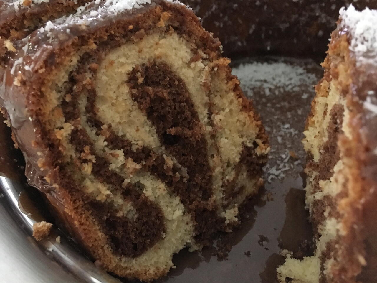 Na forma untada intercale a massa branca com a massa de chocolate. Asse em forno preaquecido a 180 graus por 50 minutos.
