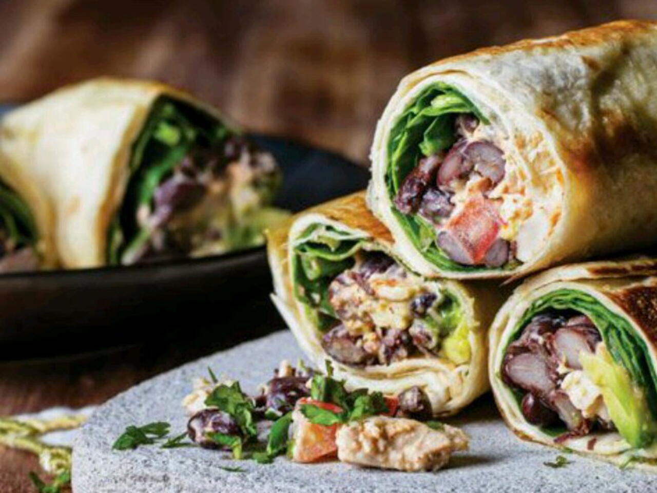 Escorra o feijão. Distribua os espinafres numa das laterais das tortilhas. Em seguida, disponha por cima um pouco de feijão e a mistura de frango, terminando com o abacate em fatias. Enrole bem as tortilhas recheadas.