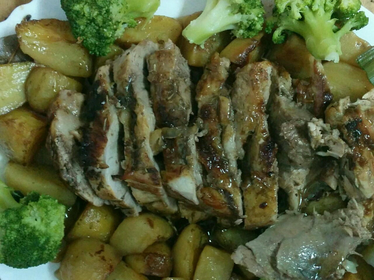 De seguida, coloquei as batatas, já escola em volta da carne e voltei a colocar tudo no forno por mais 15 minutos.