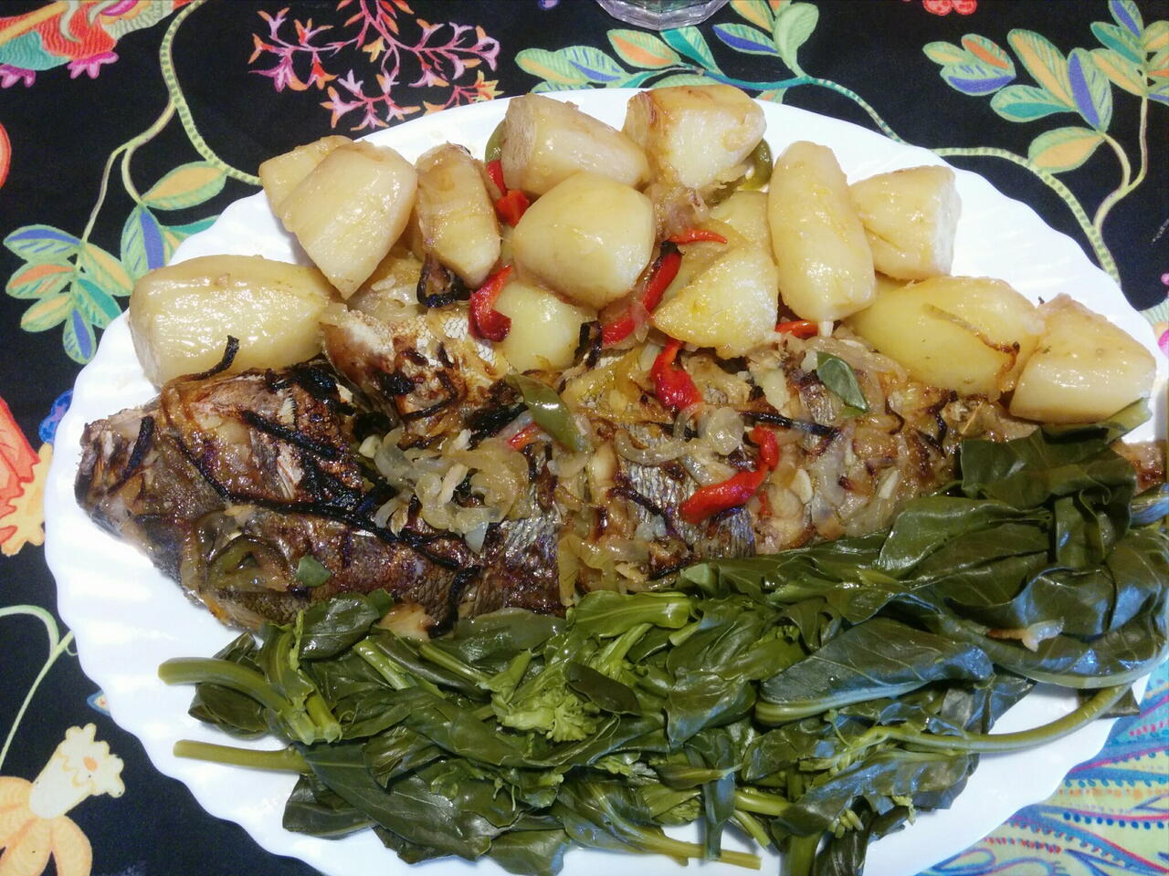 Deixou estufar até a cebola ficar meio transparente e colocou o preparado em cima do peixe e o piri-piri. Entretanto a água das batatas já estava a ferver e colocou as batatas no tabuleiro em volta do peixe.