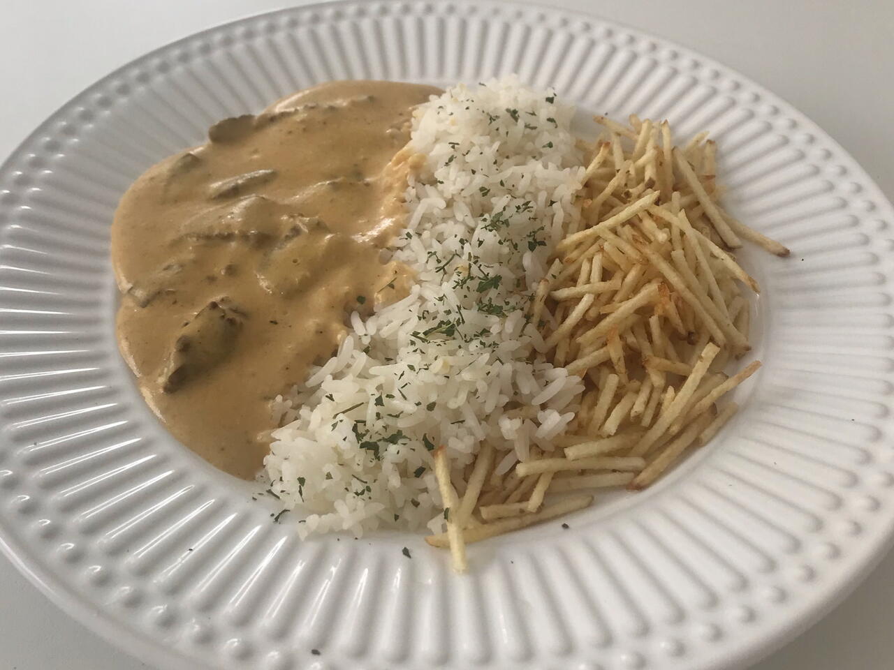 Depois colocar os demais ingredientes , creme de leite, catchup, mostarda e molho inglês. Servir.