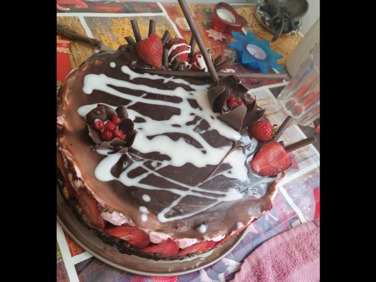 Tăiem căpșunile în jumătăți și le punem pe marginea inelului, după care turnăm cremă peste ele, o nivelăm și turnăm bolul cu ciocolată și frișcă pregătit anterior.