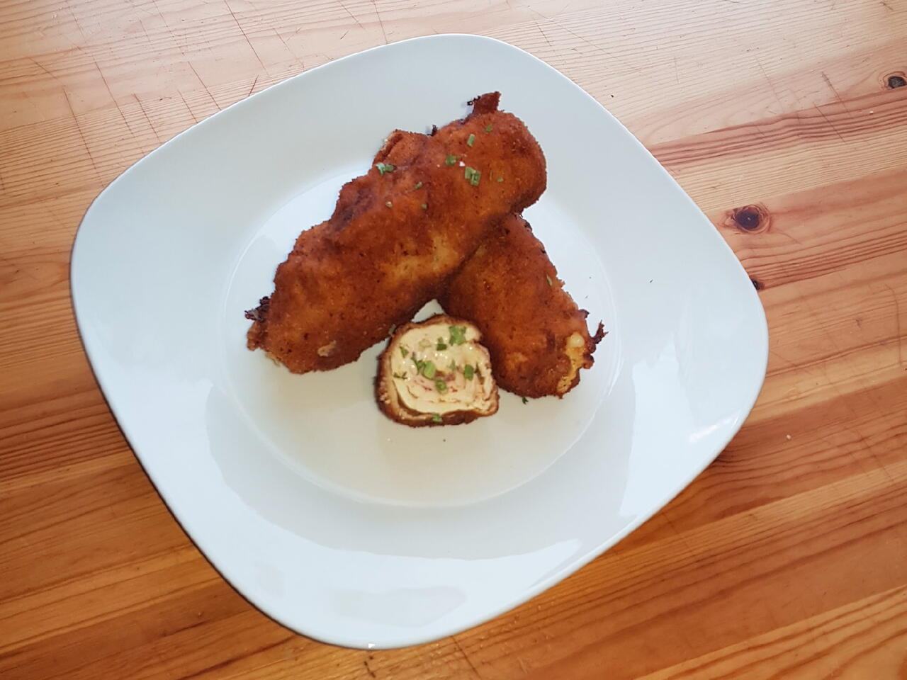 Peste pieptul de pui așează mai întâi felia de șuncă apoi pe cea de cașcaval.