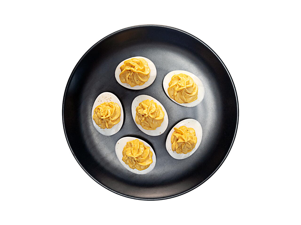 Clătiți ouăle pentru a îndepărta orice particule de coajă eronate. Apoi, cu un cuțit ascuțit, tăiați fiecare ou în jumătate pe lungime, îndepărtând gălbenușurile într-un bol mic.