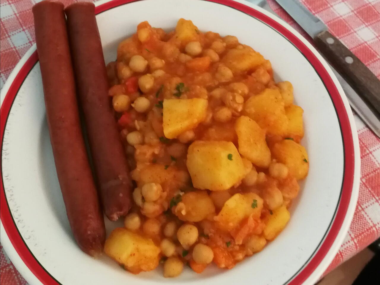 Când cartofii sunt fierți adăugăm năutul. Păstrăm 2 linguri de năut dintr-o conservă și îi zdrobim cu o furculiță îi punem peste legume pentru a îngroșa sosul și mai adăugăm boiaua, piperul și sarea după gust. Tăiem pătrunjelul proaspăt și gata. Sa aveți poftă!