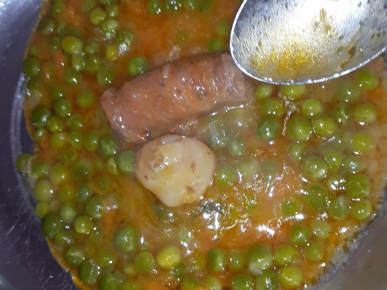 Iseckati luk i stavirti da se dinsta. Kada se izdinsta dodati grasak i krompirice i malo ga dinstati i sipati vode po zelji(ako hocete da bude gust malo vode redak vise vode). Kada se skuva zagrejati ulje sipati 2 kasike brasna proprziti i nasutu pola kasicice paprike i dodati zacine(zaprziti) kada zaprzite rucak je spreman za serviranje.
