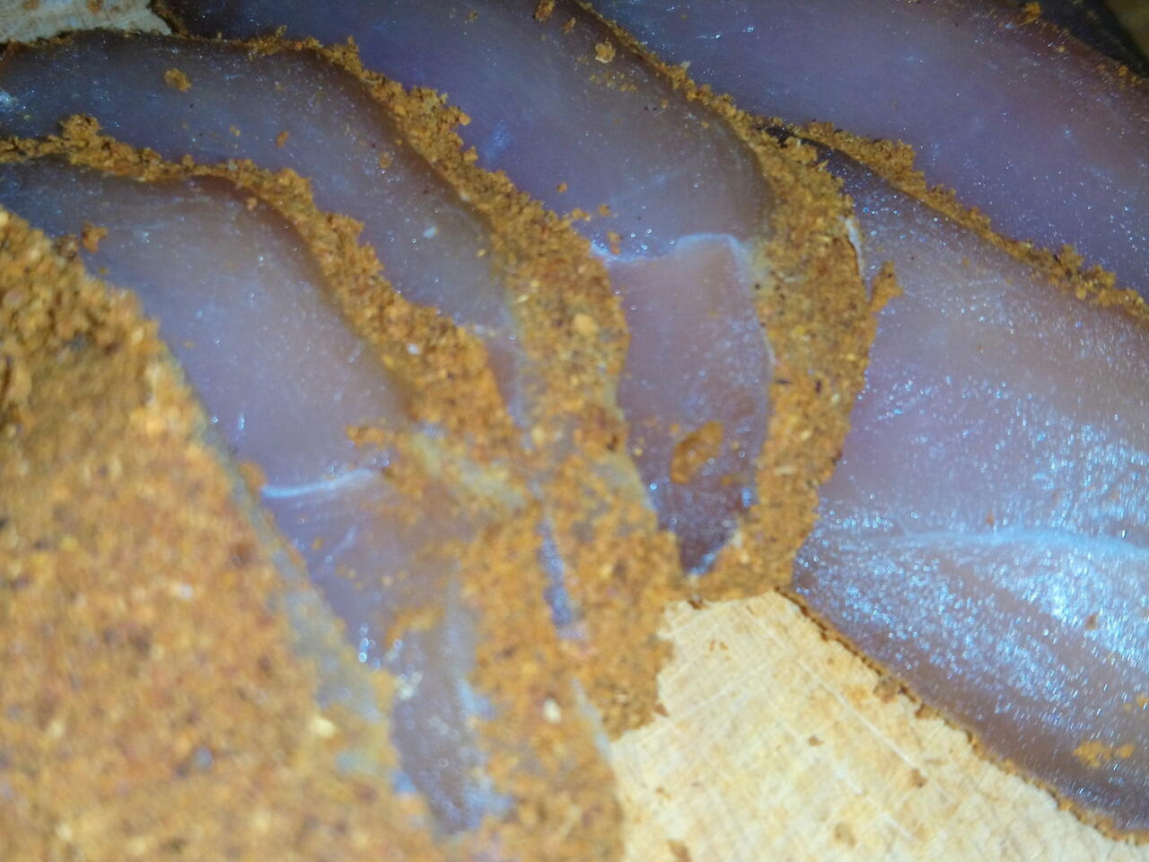 Теперь грудку нужно подвесить в хорошо проверяемом помещении на 2-3 дня. Я обматываю в небольшой слой марли и отправляю сушиться на веранду (но не в жару, в более прохладную погоду).