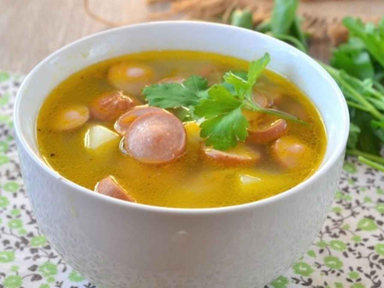 Добавьте овощи и сосиски. Посолите по вкусу и варить еще пару минут. Затем снимите суп с огня и дайте настояться в течение 15 минут.