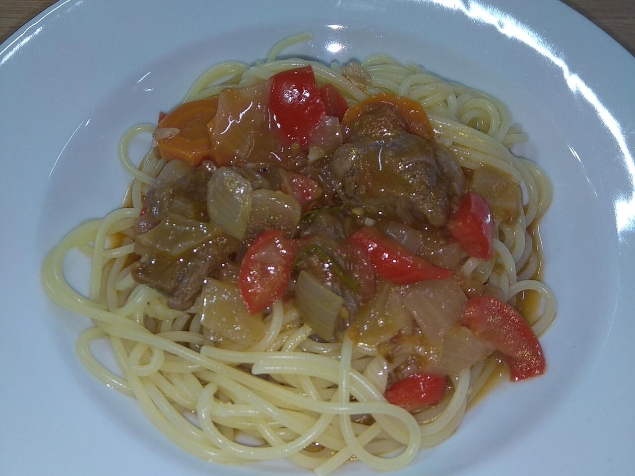 К мясу положить масло. Усилить огонь. Лук порезать средними кубиками, морковь кружками, паприку кубиками. Овощи по очереди выложить к мясу и обжарить
