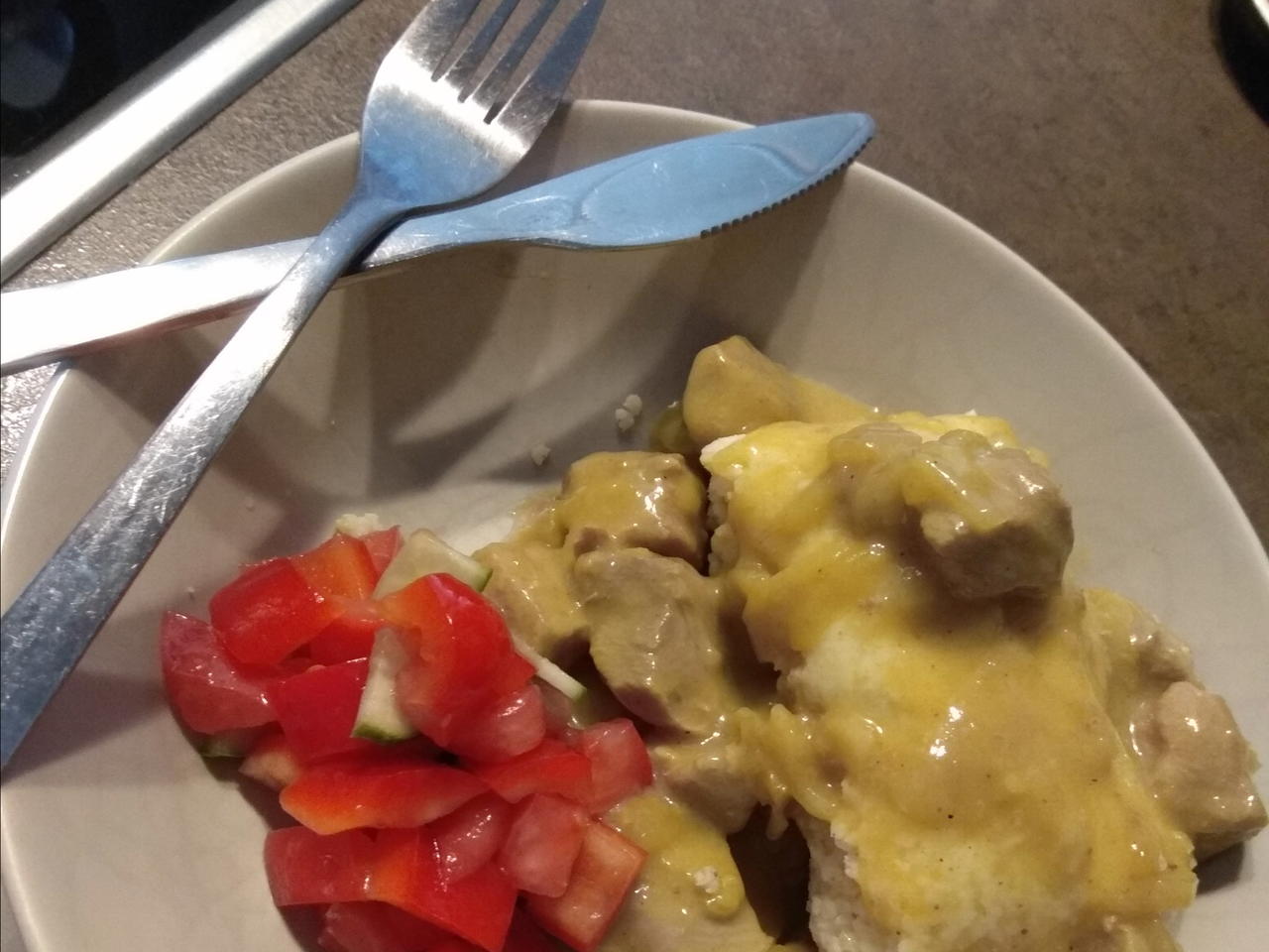 Следом за луком, сразу, влить кокосовое молоко, добавить карри, перец по вкусу, если нужно, досолить и довести до кипения.